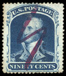 1860, 90¢ blau. Tiefe, satte Farbe, sauber magenta handschriftliche Entwertung, gut zentriert mit leuchtenden Farben; winziger Eckbug unten rechts und ohne Bedeutung, perfekte Wirkung, mit klarem 2009 P. F. Attest und fehlend P. F. Attest (#436061). Scott Nr. 39; $3,250. eine wunderschöne Briefmarke und eines der schönsten 1860 90¢ blau hoher Wert. Gestempelte Stücke von Scott 39 sind um einiges rarer als ungebrauchte Stücke, als sie gültig waren für einen kurzen Zeitraum von Zeit und waren auch nur verwendet nach zahlen hoch Portoraten. Seit vielen Jahren dieses magenta Stempel war gedacht zu wurden gebraucht in Shanghai, China, allerdings Nachweis jetzt Punkten zu Verwendung ab New York Stadt. Die magenta Wellenlinien Federzugentwertung auf dieser Marke ist sowie gesichtet auf die rekonstruiertem Einheit von fünf abgebildet im Ishikawa Buch und Verkauf Katalog.