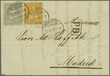 Spanien 1872: 20 Rp. hellbräunlichorange und 30 Rp. hellultramarin, zwei farbfr. und gut gez. Einzelwerte, klar gest. "NEUCH'ATEL EXP. LET. 12.VIII.72.-3" mit nebenges. "P.D" im Kästchen (AW 365) auf frischem und vollständigem Faltbrief nach Madrid, Spanien. Rücks. Taransitstp. "GENÈVE LET. EXP. 13.VIII.72.VII" und Ankunftsstp. "MADRID 16 AGO 72". Befördert mit direktem Kartenschluss ab Genf und mit 50 Rp. portogerecht bis zum Bestimmungsort frankiert für einen einfachen Brief im direkten Postaustausch gemäss Postvertrag vom 1. November 1867. Schäfer: Spanien=7/13 Punkten.