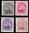 Azores 1884-87 D. Luís de frente. 4 stamps Mf#52+54+55(x2), of 5 reis, 20 reis and two of 25 reis, plain paper and porcelain and perforation 11 3/4, with oblique SPECIMEN overprint struck in black. Stamps distributed with the 1905 reprints. New stamps, ungummed, with irregularities in the perforation and some traces of oxide. Catalogue value €94