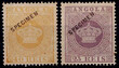 Reprints Angola 1885 * 1870-77 Crown. 2 reprints of 40 yellow reis and 25 lilac reis with oblique SPECIMEN overprint, in 13.5 perforation. New stamps, with gum and hinge and paper adhesions, and good color. Catalogue value € 90