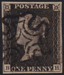 QUEEN VICTORIA 1d.. Plate 8, letters BH, used with black Maltese cross cancellation. Four wide margins, from huge to regular. Fine