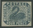 1854-55 Swans Lithographs Imperforate 4d slate-blue SG 3c, an unusually large example with margins good to large, unused, Cat £4000. RPSV Certificate (1984). Superb. Ex Dr Cecil Walkley: sold at our auction of 14.4.2005 for $3495 (Sale 115 Lot 219). RPSV Certificate (1984). The Lord Vestey/Trevor Hiscock example sold for $3660 (Sale 215 Lot 105). They are the two finest 'slate-blues' we have offered