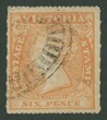 1857 QV Woodblocks Experimental Separations by Calvert 6d orange-yellow as SG 61 but Serrated 18-19xRouletted 9 (vertically), minor separation fault just clear of the design at lower-left. Discovered by Les Molnar, and believed to be the only recorded example. Ex Les Molnar: sold for $1220 (Sale 174 Lot 174)