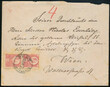 1872 Réznyomat 5kr elfogazott függ?leges pár túlsúlyos levélen Bécsbe / pair with shifted perforation on overweight cover "PEST LIPÓTVÁROS" - Wien