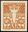 2 F. postal stamp, trial printing of the III. plate in original colour on white not gummed cardboard paper, photo expertize Zrinjscak BPP