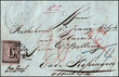 Type III, 93. Stamp of the sheet, having very fresh colours, on all sides full margins, the cutting lines at all 4 sides visible, at the bottom with margin of sheet, perfect, black ZÜRCHER rosette, on folded letter with large double circle posting postmark Staefa 15 JUIN 1844, over Zurich with on the back transit postmark, in the closed mail exchange with Bavaria, addressed to the alderman P. Jenny from GLARUS, by mister Dr. Balling in BAD KISSINGEN. 6 Rp. Postage for a canton letter franked to Zurich, in accordance with tariff, effective from introduction of the stamps. Red "AUSLAG from Zurich" (Winkler number 694), in accordance with shepherd used 1842 / 50. The above with "no. 2" in red ink numbered letter was rated with "6" Kreuzer Auslag for the benefit of Zurich, 14 Kr. Bav. Postage in total 20 Kr. In accordance with the postal agreement Zurich Bavaria from 1829, Bav. Postage in accordance with tariff 1.12.1810, 36-42 miles. The stamp is especially fresh colours, with especially clear background lines, on the extraordinary international letter. So far was no franking a ZÜRCHER cantonal stamp abroad known. The unique letter is in perfect condition. Certificate Eichele