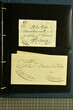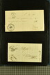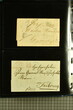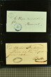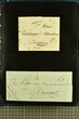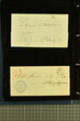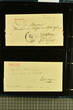 Kanton Freiburg 1807/60 (ca.): Sammlung von 80 zumeist vorphilatelistischen und vereinzelten markenlosen Briefen mit vielen seltenen Haupt- und Nebenstempeln, Portofreiheitsstempeln, Verrechnungsstempeln, Taxzahlenstempeln, Wertbriefen oder Post ins Ausland nach Österreich oder Frankreich. Dabei viele seltene Stempel wie zweizeiliger Stabstp. "FREIBURG / 25. MAJ" mit kleiner Tages- aber grosser Monatsangabe (Wi. 2491/11) in schwarz auf Portobrief nach Dornbirn, Vorarlberg (1825), Stabstp. "ROMONT" in rot (Wi. 2600a/11) auf Valorenbrief nach Fribourg (1848), "RUE" in derselben Farbe (Wi. 2610a/9) auf Valorenbrief nach Fribourg (1844), zwei Briefe mit dreizeiligem Stabstp. "MONTET / PRÈS / D'ESTAVAYER" in rot (Wi. 2578a/8), Kursivstp. "Dompierre" in schwarz (Wi. 2564/7), achteckig gefasster Stabstp. "DOMPIERRE" in rot (Wi. 2565/7) oder Ovalstp. CHÂTEL-ST-DENIS" (Wi. 2553/8) und "MORAT" in schwarz (Wi. 2586/7). Ferner kursiver Postroutenstp. "Route de Charmey" in schwarz (Gasser 96d=8P) auf Amtsbrief (1861), seltene Nebenstempel wie "P.P." von Estavayer in schwarz (Wi. 2573/11), irrtümlicherweise angebracht auf Teilfrankobrief mit Vermerk "franco frontière" und Stabstp. "ESTAVAYE" in schwarz nach Besançon oder "P.P." im Doppeloval in schwarz von Fribourg (Wi. 2507/9) resp. rot von Rue (Wi. 2613a/8) oder Portofreiheitsstp. wie nicht katalogisierter Negativstp. "LA COMMISSION DU FEU / DE LA VILLE DE FRIBOURG" mit illustration eines Spritzenwagens rücks. auf amtlichem Faltbrief ohne sonstige Stempel innerhalb der Stadt Fribourg (1840). Etwas unterschiedliche Erhaltung.