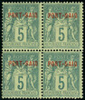 Emission provisoire, caractères BATONS 11 valeurs différentes entre 1 et 50c inclus, 5c vert foncé et 10c type I, non référencés dans Yvert, tous en blocs de 4, TB, rare