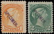 1870, Small Queen, 1¢ yellow & 2¢ green, "SPECIMEN." overprint (Scott 35S, 36S), small sans-serif capitals in violet, o.g., 2¢ with paper hinge remnant, Fine to Very Fine.