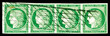 N°2, 15c vert en bande de 4 oblitération grille sans fin. SUPERBE. R.R.R. (signé Calves/certificats) Qualité: Oblitéré Cote: 13500 euros