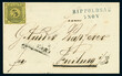 3 Kr. schw./gelb, vierseitig voll- bis breitrandig auf Brief mit blauem Nummernstempel "119" und beigesetztem blauen Zweizeiler "Rippoldsau 7 Nov" (1852) nach Freiburg/Breisgau. Luxus. Der Stempel "119" in Blau ist selten, insbesondere auf einem Ganzstück in so vorzüglicher Erhaltung. Fotoattest Flemming BPP. Provenienz: Aus der Professor-Franz-Sammlung (8. Berlin-Auktion unseres Hauses, August 2013, Los 1003).