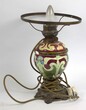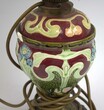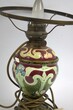 Jugendstil Tischlampe im Petroleum Stil mit Messingfuß, Majolika Teil mit floralem Dekor (seitlich mit Chip) ohne Lampenschirm. Höhe ca. 40 cm. Nicht auf Funktion geprüft!