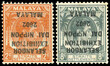 1942 Selangor Exhibition, 2c orange and 8c grey, type 14 opt, each error opt inverted, part o.g. and large part o.g. respectively, Far Nicer perfs than usual on this issue. A scarce pair. (cat £650)