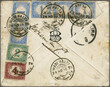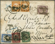 1893: Cover from Great Britain underpaid (at triple rate) with single 1 d. lilac used from Aberfeldy (Nov 2), addressed to a member of the 17th Lancers in Cairo. Taxed on despatch with framed 'T' and 65 centimes in manuscript, twice taxed in Cairo with 1888 Postage Due 2 m. green, 4 m. maroon, 1 pi. ultramaine and pair of 2 pi. orange (voided with 'T' marking). Re-addressed to Halfa and reverse with Postage Due 2 m. green, 4 m. maroon and 1 pi. ultramarine (5) all tied by WADI HALFA datestamps (Nov 24). Some faults due to journey, but a marvellous cover bearing the complete set of 1888 Postage Dues