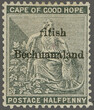 First Issue: Overprinted in lower case by W.A. Richards & Sons, Cape Town 1885/87: Cape ½ d. grey-black, wmk. Anchor, overprinted Type 1 in black, an unused example showing variety "ritish" for "British", slight aging on large part og. A rare stamp. Cert. BPA (2023) Gi = £ 2'750