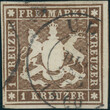 1859, 1 Kr., dark-orange-brown (depth dark brown), on all sides having full to wide margins imperforated, right having huge margins, clear cancelled by dual circuit cancel "ULM 3 DEC. 1860", nice and faultless choise copy condition, old signed and expertized Irtenkauf with photo certificate, Michel 800,--.