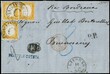 1862 - 80c bright orange, three copies cancelled in transit with “LIVORNO VIA DI MARE C' (18 April 1863), on cover from Naples to Buenos Aires. The 80c at top right with slightly shortened perforations by scissors, the lower example with a light crease ca
