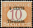 1917 - Tientsin: Postage due 10c orange and carmine overprinted 4 CENTS TIENTSIN, local machine overprint. Rare, cert. Sorani (Sassone T5 - Euro 18,000)
