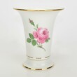 Funnel vase red rose Meissen, sword brand, 2 sanding throughs, to 1948, on deducted grooved foot wide swinging wall, in purple and green painting in the decor red rose, gold rim, H approximate 16, 5 cm