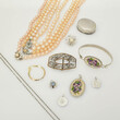 Mixed lot fashion jewellery silver 925 and 835, silver-plated and metal, in total 13 parts, as well 1 bangle and 1 pendant with flower embroidered picture in the oval, 3 pendant, of it 2 x with zodiac sign, 1 gilded Creole, 3 strings of artificial pearls, in addition to it 1 chain clasp, as well 1 double anchor chain with spring ring clasp, 1 pillbox and 1 belt buckle, various age traces, D approximate 1, 6 cm to 6, 4 cm, rope L to approximate 118 cm, silver together approximate 7 g