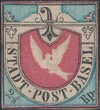 Basel Dove 2 1/2 Rp red / bright blue / black, especially fresh colours, right been glued marginal gap, left cut into, otherwise very good stamp cut, plate flaw: right above bevel diagonal pale line, very fine Basel Dove with nice distinct relief in unused condition with parts of the original gum, certificate Marchand, 28'000. Plus 1'250.