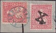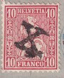 Small circle date stamp without year and time cancels: ALVENEU BAD 3. V (light blue cancel) no. 38 twice on piece with X cancellation (postal district Graubuenden 10. Postal district) impeccable perforated stamps with very rare cancel combination ! !