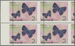 1977, KOREA north: butterflies 2 Ch. 'Rapala arata' with strong to the right shifted vertical perforation block of four, mint never hinged from left margin of sheet, attractive and rare