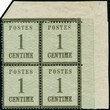 N° 1. 1c vert-bronze, bloc de 4ex, traces de charnières en marge effleurant 2ex, CdF, T.B. Cote Maury