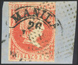 9. 1861. 5 cuartos bermellón, sobre fragmento. Matasello baeza MANILA / ISS.FILIPS y CIRCULO DE PUNTOS. MAGNIFICO Y RARA COMBINACION DE MATASELLOS.