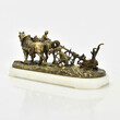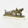 Bronze, mehrteilig gearbeitete Bronze, natürlich modellierter Terrainsockel, doppelt bespanntes Pferdefuhrwerk einen Pflug hinter sich herziehend, der Pflug beweglich gestaltet, auf dem Rücken des rechten Pferdes der Bauer kontrollierend nach hinten schauend, sehr detailreiche Ausformung von gelungener Gussqualität, auf Marmorplatte montiert, L ca. 26 cm, erste Hälfte 20. Jh