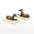 Bronze, patiniert, in unterschiedlichen Haltungen liegende Windhunde, die filigranen Halsbänder separat am Körper montiert, rechteckige Marmorplinthe in warmem Weißton, nach Vorbild eines Berliner Eisenkunstgussmodells von 1820, vorliegend wohl um 1920, L je ca. 17 cm