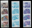 1993, American Musicals, three imperforate proofs of se- tenant booklet pane of four 29c values in full color, in blue only and in blue and magenta colors only (design is slightly different from issued stamps), all with full OG, NH, VF and very rare, C.v. $1,250 for finished design pane only, others priced with ''-'', Est. $1,000-$1,200