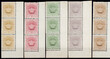 Reprints 1885 * 1876 and 1881-85 Coroa and Coroa new colors. 5 TRIOS of reprints in the corner of the sheet of 20 reis bistre and 25 reis mauve pink, 50 reis green, 100 reis lilac gray and 300 reis brown, with small PROOF overprint. New copies, ungummed, with partially cut perforation on the left side in the 20, 50 and 200 reis, with good color. Catalog value € 600