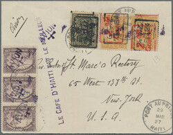 cover ...más 1931, From PORT AU PRINCE Haiti to Berkeley California, airmail cover mailed by Lt. Comdr. A. M. Locy U.S.N. of the 1st Brigade U.S. Marines stationed in Haiti, franked with blue 10 cents Winged Globe airmail stamp tied by duplex military cancel U.S.M.C / MAR 13 / 9 AM / PORTO PRINCE HAITI / 1931, large violet handstamp VIA AIR MAIL and routing VIA MIAMI FLA, typed address and military sender cachet at upper right, historic context: U.S. military administration of Haiti (1915–1934), rare usage of U.S. postage and naval postal service during occupation period, outstanding example of Banana Wars-era military airmail from Caribbean outpost, ex Kugel, XF Estimate 300€.