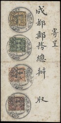 1913年西藏察木多寄成都郵務總辦封,貼西藏蟠龍票4枚,銷售少見的西藏察木多癸醜年大圓戳。封中折,有黃,上中品。