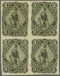 1870 (Aug): 3 r. black on white wove paper, an unused block of four with large even margins all round, crease at top and left on frame lines not detracting from appearance and with pinhole in top right corner, otherwise fresh and very fine unused. An extremely rare multiple. Signed Holcombe Scott = $ 900+. Provenance: Collection Ramón Benítez Ciotti, Corinphila sale 145, 5-8 Aprl 2006, lot 4783.