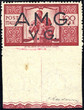 1945-47, Democratica 100 L. carminio scuro non dentellato in basso e con bordo di foglio integrale, soprastampa "A.M.G. / V.G.", nuovo con gomma originale integra, dent. ruvida (Sass. 21ia, € 4.500)