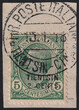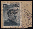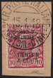 TIENTSIN SOPRASTAMPA A MANO. Francobollo con soprastampa locale da 6 cents su 15 centesimi con la soprastampa spostata in alto, sull'effigie del sovrano (n.3, NON CATALOGATO), annullato su frammento, unitamente ai due valori LEONI sempre annullati su frammento con soprastampa regolarmente in basso (nn. 1+2). Certificato Diena, 2011
