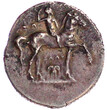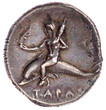 Nomos (Didrachme) 280/272 v. Chr. Reiter r., sich selbst bekränzend, unten Kapitell/Taras auf Delphin l. mit Akrostolion und Spindel. 6,39 g. fast vorzüglich, schöne Patina