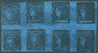 GJ.7, 3c. dark blue, block of 8 examples with 9-bar cancel of Corrientes, rare and VF!