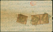 1870, Turkey postage due 20 pa. brown, 1869 issue perf. 13¼, horizontal pair and single, tied to entire letter from Beirut to Damas, paying the rate for three dirhems up to 100 route hours; each tied by fine strikes of small triple boxed "BEIRUT / 81" handstamps in blue (Coles & Walker fig. 4), tiny toned, stamps and postmarks excellent