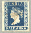1854, 1/2 a., indigo, East Indian Company Administration, lithographed in Calcutta, imperf, Die I, stone A, 22nd group, pos 22, fine retouch to eye, eyebrow, hair & base of bast, used, small to good margins, XF! Estimate 400€.