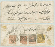 1890, 1/2 a, orange, (2) on wove, (1) on laid + 2 a, red/yellow, imperf., the laid paper probably is a forgery that was genuinely used (see SG text below 161a), all stamps removed and reattached with hinges, on letter from Kashmir, all stamps with faults, still an interesting and desirable letter, F-VF! Estimate 400€.