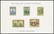 404Hb, 611MTa. 1928. 3 cts castaño y verde, 1 pts castaño y tres sellos Tipo Tasas de Portugal, en los colores azul, pizarra y verde. SIN DENTAR y con sobrecarga WATERLOM AND SONS LTD. / SPECIMEN, sin taladro y adheridos sobre hoja de carnet MUESTRA. MAGNIFICO Y RASISIMO CONJUNTO.