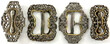 4 Kraton-Gürtelschnallen (2 Paare) aus Yagyakarta, Messing versilbert mit Glas-Steinen. Höhe je 75 bis 90 mm.