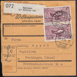 45 Fr. Saar IV, vertical pair on face on inland parcel card to skewer (Saar) / 13.5.54