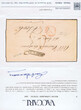 1859, from Milano to Ascoli, printed matter (circular) with framed MILANO 3–11 handstamp and red manuscript charge 2 bajocchi due from recipient, blue straight-line CIRCOLARE marking, red boxed Stamp. Franchi Milano 3 Nov. 59 sender cachet, reverse shows transit MACERATA 6.11.1859 and arrival ASCOLI 7.11.1859, rare and well-documented usage of Austrian-style internal postal documentation just after political transition, referenced in M. Menatschci 2007 as a postal history rarity, accompanied by 2021 Vaccari certificate confirming authenticity and exceptional quality, XF! Estimate 3.000€.