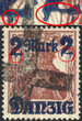 2 M on 35 Pf Germania with overprint flaw "base both numeral of value 2 jumped off" with cork cancel -cancellation with photo certificate Gruber BPP "re. Perf tip shortened, otherwise genuine and immaculate", R