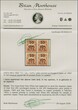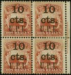 1883: Surcharged “10 cts. U.P.U.” plate printed in black on 2 reales orange-red, left side imprint marginal block of four, fresh colour, perforations generally fine, no gum, corner crease top right. Perforation separation between two right hand stamp, reinforced with hinge. Rare reprint for UPU surcharge, using the machine press. Cert. Moorhouse (2009).