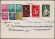 15+5 Pf. Rotes Kreuz und zwei Volkshilfe-Werten nebst sechs Heuss-Werten als interessante Weitersendung "ST. INGBERT" über "ISERLOHN" 1954 nach St. Ingbert (unterer 5 Pf. Wert Eckfehler)